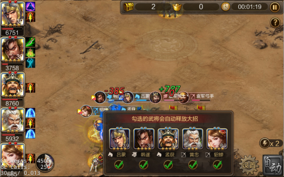 界面左侧有5个头像,分别对应出战的5名武将。武将在战场中会自动累积战意值,当战意值满之后,武将头像会变亮,此时点击头像,对应武将即可释放武将技。
