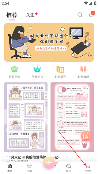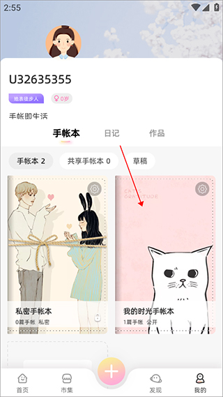 1、若是用户想要去除自己手账中的模板水印,那么首先就需要先点击进入个人页面中,在里面打开自己记录的手账进行编辑。