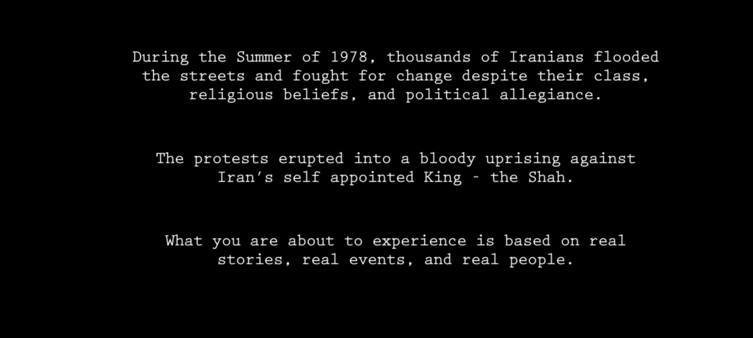 抗议爆发为一场针对伊朗自封国王的血腥起义。你将要体验的是基于真实的故事、真实的事件和真实的人物。
