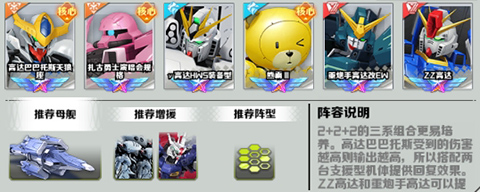 2+2+2的三系组合更易培养。高达巴巴托斯受到的伤害越高则输出越高,所以搭配两台支援型机体提供回复效果。