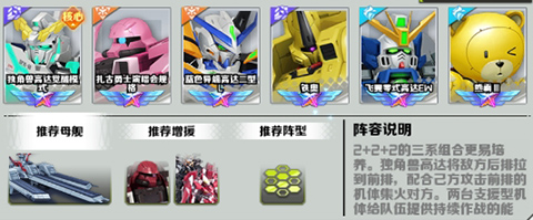 2+2+2的三系组合更易培养。独角兽高达将敌方后排拉到前排,配合己方攻击前排的机体集火对方。