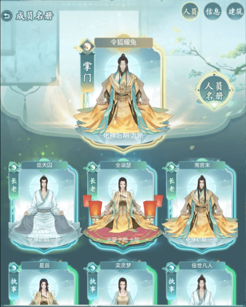 门派大殿主要展示仙门主要人员(掌门、长老、执事),道友可以通过挑战相应人员,来获得其现在所处的位置,门派建筑是关系到仙门各建筑的效果,仙门内只有掌门可以进行升级。