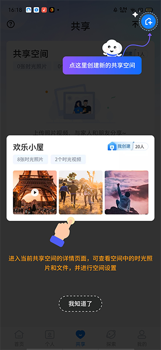 4、进入当前共享空间的详情页面,可查看空间中的时光照片和文件,并进行空间设置;