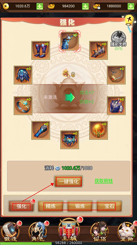 3、穿戴后的装备都可以进行一键锻造强化,提升等级,获得额外属性加成,后期还可以进行精炼、锻炼、镶嵌宝石,打造一套神装。