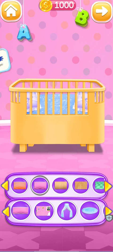 1、在本站下载该游戏,打开进入,这里的每个婴儿用品图标都代表着一个游戏模式,在这里我左右滑动选择了一个漂亮的婴儿床。