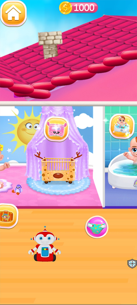 4、装饰完之后就可以把可爱的宝宝抱进婴儿床啦,另外点击收集出现的金币,给宝宝攒点奶粉钱吧。