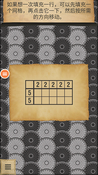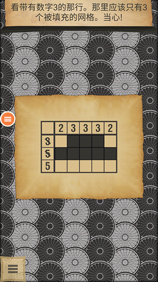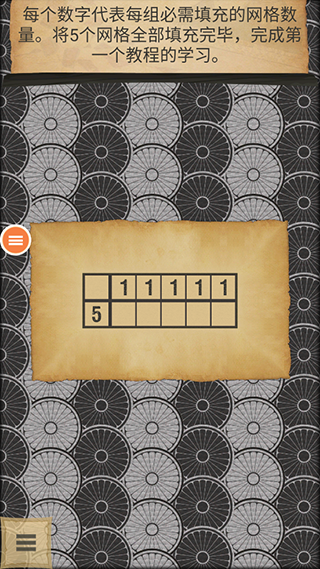 1、每个数字代表每组必需填充的网格数量。将5个网格全部填充完毕,完成第一个教程的学习。