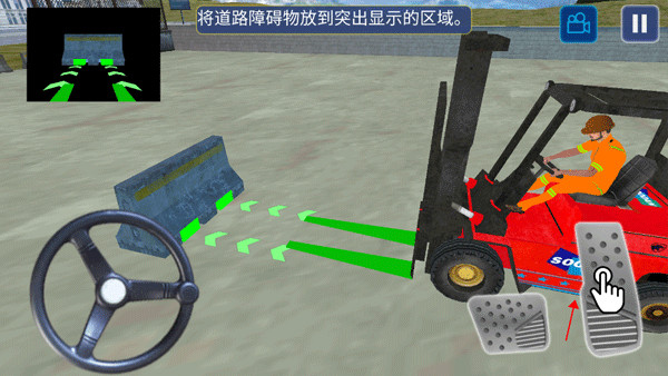 6、第二关是将道路上的障碍物放到突出显示的区域,点击油门将叉车靠近到障碍物。