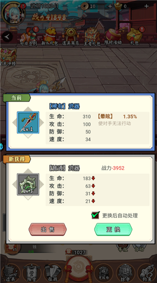 2、如果获得当前已有的装备属性更低进行出售,更高则装备即可。