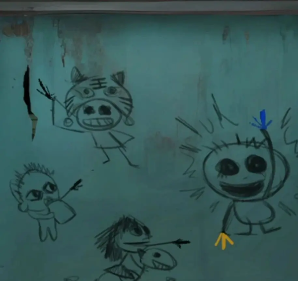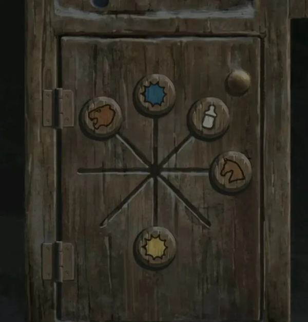再查看一下左边的柜子,图案刚好对应我们黑板上的图案,调整【虎头↖】【奶瓶↗】【木马→】【蓝色↑】【黄色↓】打开下面的柜子,拿到一个【剪纸小人】和一面【锦旗】,剪纸小人的姿势看起来有点眼熟,不就是安全通道的那个跑步小人吗?出来,走廊触发老奶奶剧情,这奶奶一看就是言她的盲奶奶吧!后面还没玩不确定哦。