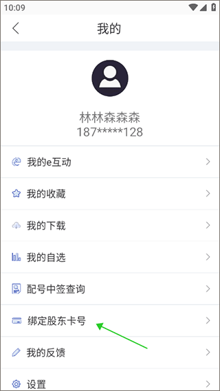 2、点击头像按钮进入“我的”页面中,点击“绑定股东卡号”