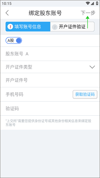 4、在进入的新页面中,按信息提示依次输入个人信息,并获取验证码,等系统通过后,就可点击“下一步”,进入开户证件验证环节,完成这两步后系统将会完成绑定股东账号流程