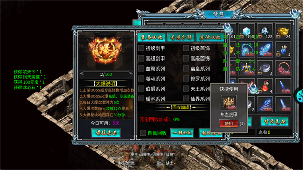 6、刷怪获得的多余装备可以进行一键回收,获得元宝