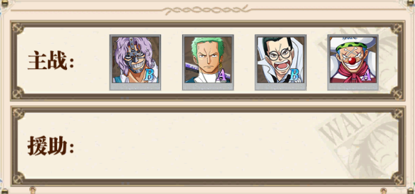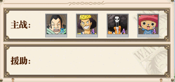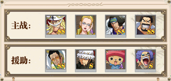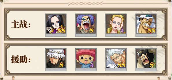 1号位斯潘达姆,2号位索隆,3号位克洛,4号位巴基,1号位送死不上援助,2,3,4号位援助上能减速或加速的。优化伙伴容易获取也易觉醒,突破,爆发威力一流,非常适合新人。