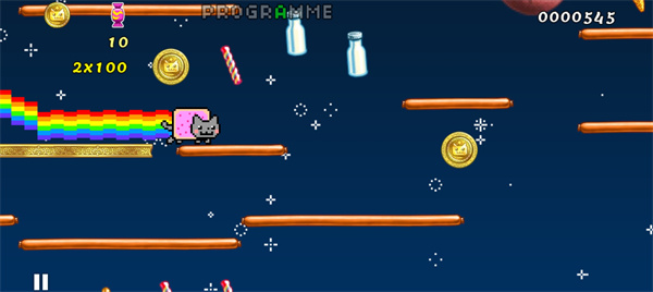 彩虹猫迷失太空官方版是一款2D横版的跑酷手游,英文名叫Nyan Cat: Lost In Space。游戏采用像素画风打造,还加入欢乐的音乐,游戏中玩家将扮演一只彩虹猫在太空中进行跑酷冒险,玩家可以控制小猫的速度与方向,在宇宙、迷城、小镇、田野等各种精美的场景中快乐奔跑。彩虹猫迷失太空游戏内玩家需要控制彩虹猫躲避游戏中的各种机关陷阱,游戏中还有着非常多的东西需要玩家控制彩虹猫去吃掉,每吃掉一个东西都会获得积分,玩家需要得到高分就需要尽量的多吃东西。