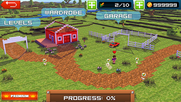 2、场景内有三个白色圆圈可以点击,左边的栅栏是选择关卡,中间房子是编辑角色,右侧的卡车是更换使用的汽车或者升级。