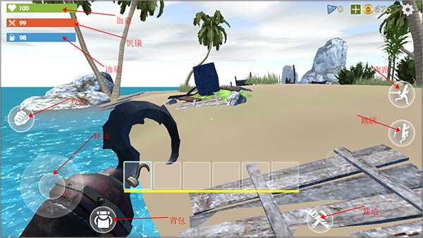 1、下载安装好孤岛冒险求生官方正版,进入游戏,基本操作如下图。