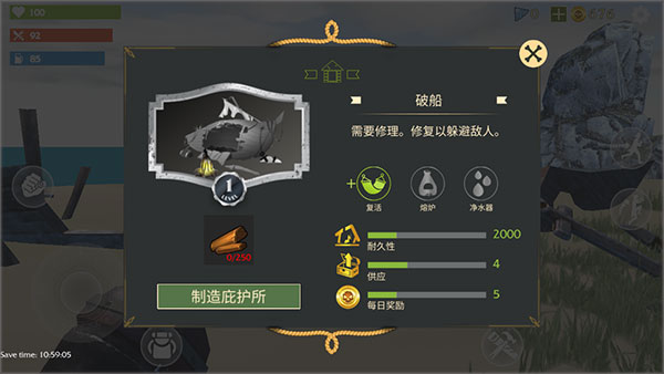 4、收集所有有用的物品打造庇护所,尽自己最大的能力生存下去吧。