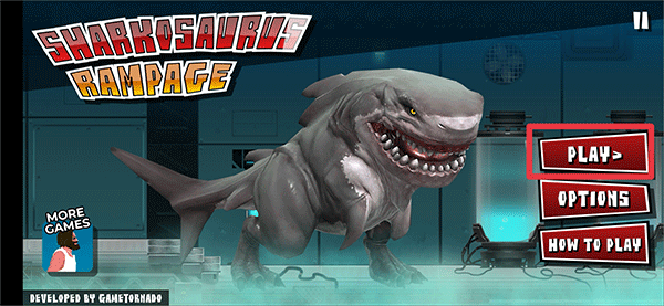 2、游戏开始后,首先点击右下角按钮操控鲨鱼咬碎开关,让自己能够逃离水箱