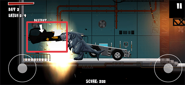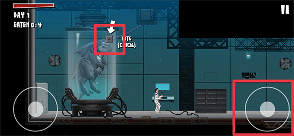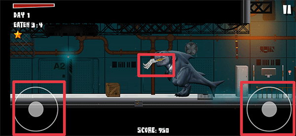 3、左边按钮上滑为跳跃、下滑为蹲下,然后通过左边按钮左右滑动控制鲨鱼前进,并点击右边按钮吃掉途中出现的人类。