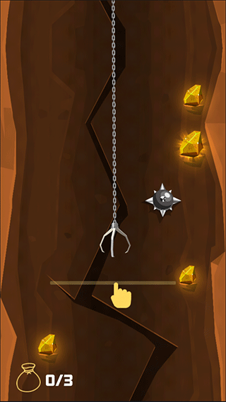 2、游戏中我们需要操控钩爪在地底抓取宝石和水晶,不过要注意躲开黑色的炸弹,否则他会炸掉你一个宝石;