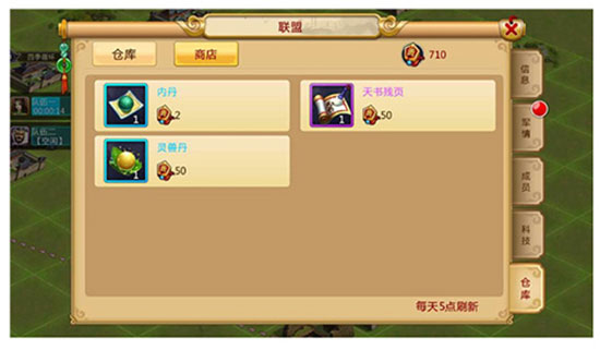 在联盟商店里可以购买内丹、天书残页和灵兽丹。这三样东西的价格是会随着购买量而增加的,只有每天前20个道具的购买才是原价,后面的会成倍上涨,这个要注意。
