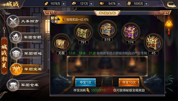 ⑾设有军团宝库,每日12/18/21点,根据军团占领城池数产出宝箱,军团成员可用“令箭”参与宝箱抽取,获取大量资源。