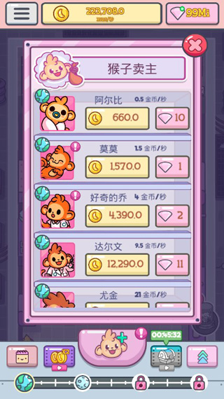3、游戏中你可以解锁不同能力的猴子,加快你的金币获取速度,用更快的速度来进入太空。