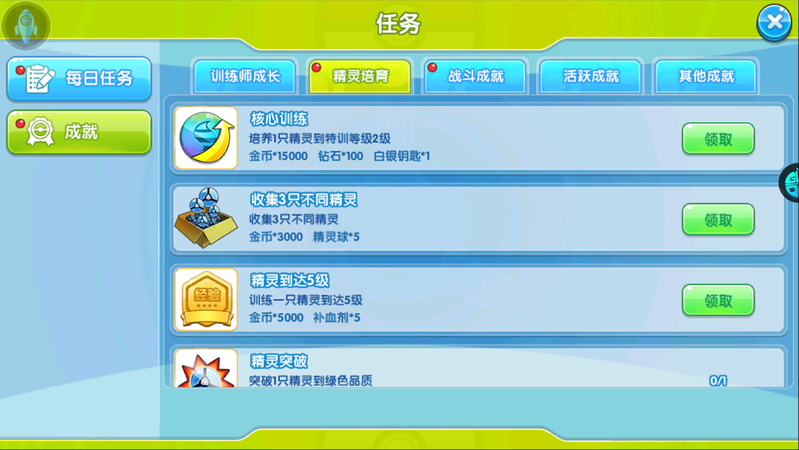 点击主页面的成长计划-成就-精灵培育,点击领取礼包