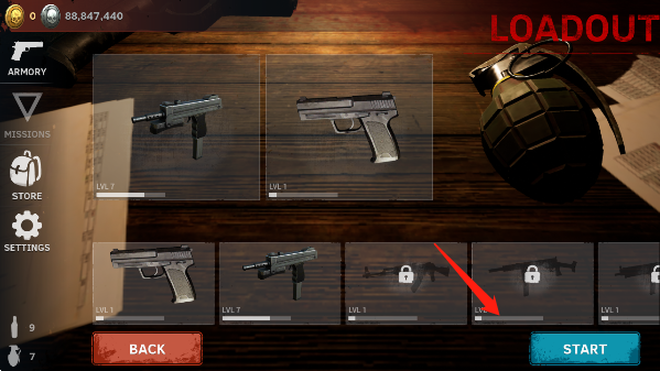 3、游戏内支持玩家在武器库中选择两把武器携带,投掷物则可都携带;