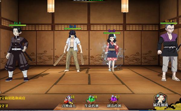 4、多元化战斗角色:游戏中玩家可以扮演动漫人物如炭治郎,祢豆子,我妻善逸等,并选择不同属性的阵容如烈火,流水,风雷,血鬼来进行战斗。