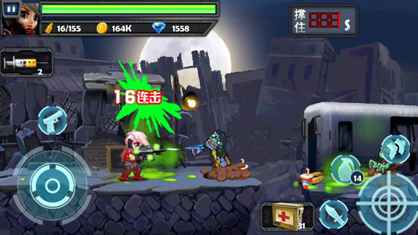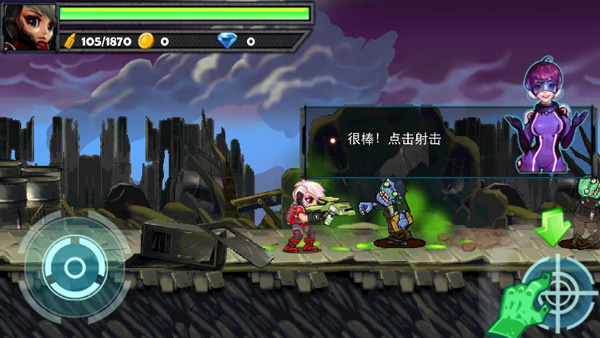 该游戏采用了卡通风格制作,横版射击挑战,操作上使用摇杆和按钮控制,左下角摇杆控制主角左右移动,有侧有一个很大的普通攻击按钮控制射击。