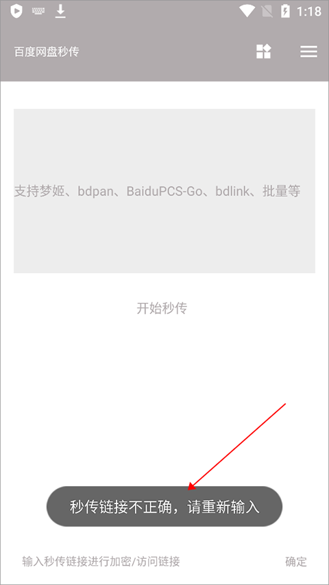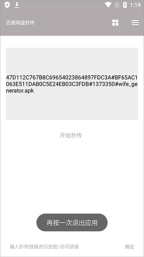 用户按照上述登录方式登录狐悠秒链app成功后,点击页面底部的输入框,输入秒传链接进行加密或访问,输入时格式要正确,不然会报错