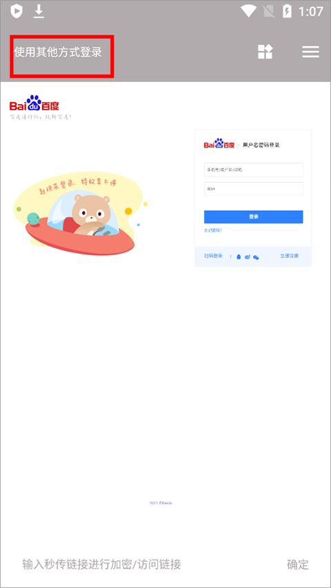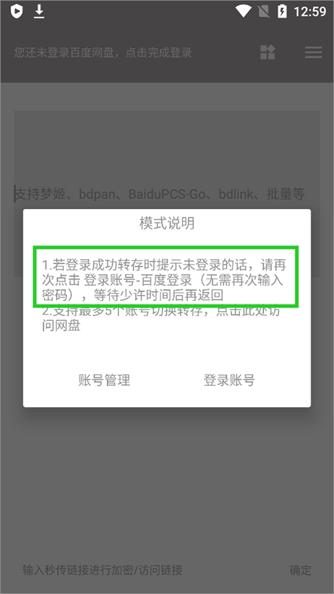 如果用户登录了百度网盘但还是出现了上述文字时,软件会提示用户按照点击提示框中的登录账号进行登录,二次登录时不需要进行再次输入密码