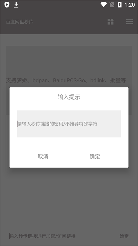 狐悠秒链app由B的UP主开发的一款可以支持梦姬、百度网盘秒传链接、iduPCS-Go、bdlink等秒传链接地址的加密和访问的手机工具应用,占内存量非常小,没有广告,可以让大家稳定使用。用户在使用时必须先登录百度网盘,并切换成正常模式时才可登录成功。登录成功后用户就可以在应用打开的界面中输入正确的秒传链接地址就可以进行上传,也可以批量输入进行上传,而且批量时是没有上限的。同时应用其中的文件传输分享功能是极为实用的,还有云盘应用转链服务技术能力,也是可以帮助大家搞定更多大文件的分享任务的。
