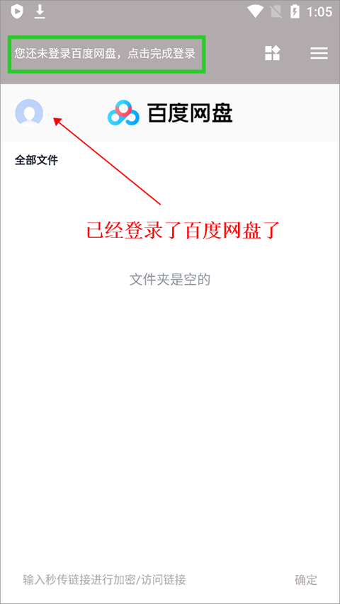 如果用户登录了百度网盘后,但还是出现了刚才的文字时