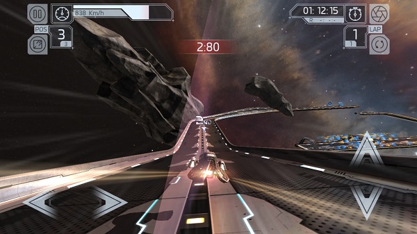 玩完才知道为啥只要100m——游戏在材质上做的很出色,给人一种太空黑科技的赶脚,宇宙背景用了整块贴图,较之于狂野飙车那种把背景也用3d捏出来当然要节约的多。