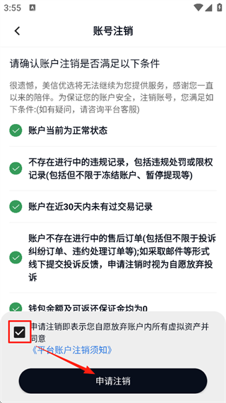 4、勾选协议后点击【申请注销】