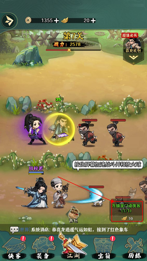 1、游戏以主线玩法为主,侠客们会自动战斗,击退敌人,玩家点击主线任务完成即可。