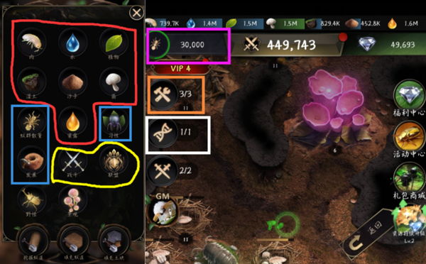 提供不同类型建筑的地方,有生产类,军事类,科技类,其中资源类为下图红色圈选处,军事类为黄色圈选处,科技类为蓝色圈选出处。这里比较重要的是蚁群数量(紫色框选),工蚁数量(橙色框选),进化菌丝(白色框选)。