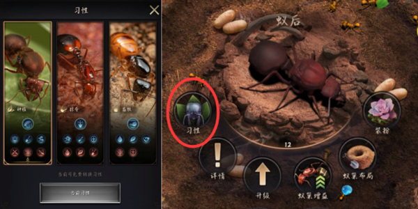 ⑨习性选择按照自身情况选择,喜欢掠夺的玩家即可选择掠夺;喜欢挂机的玩家可以从畜牧和种植之间选择;其中畜牧主要是提高没法经常性登录游戏的玩家选择,提高蜜露产量和降低进食区资源消耗;种植适合利用资源加工地定期产出各类资源以及兵蚁外出采集提高采集速度快速发展。