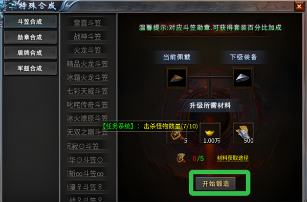 5、在特殊合成中,当有目标材料时,点击开始锻造制造新装备。