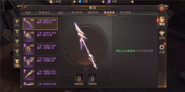 这个的要求有点高啦,需要时三星级以上的套装才可以进行洗练,洗练后的装备是可以获得一些不错的技能的哦