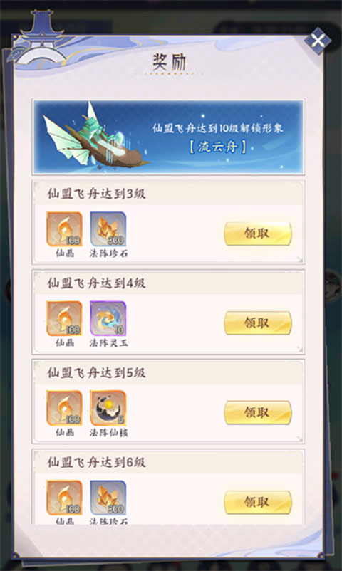 玩法奖励:仙晶、仙盟法阵养成材料、飞舟技能点数、仙盟贡献。飞舟等级提升可获得额外奖励。
