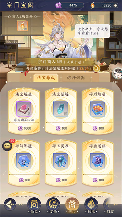 2、宗门宝阁前两天优先买蓝色法宝,准备两套给自己的两个主C,战力可以领先别人一大截,如果你是一开始就追求紫装和橙装的大佬可以忽视这条。丹方和器方在有足够的炼制材料后再兑换,不然兑换后不能炼,白白浪费贡献。