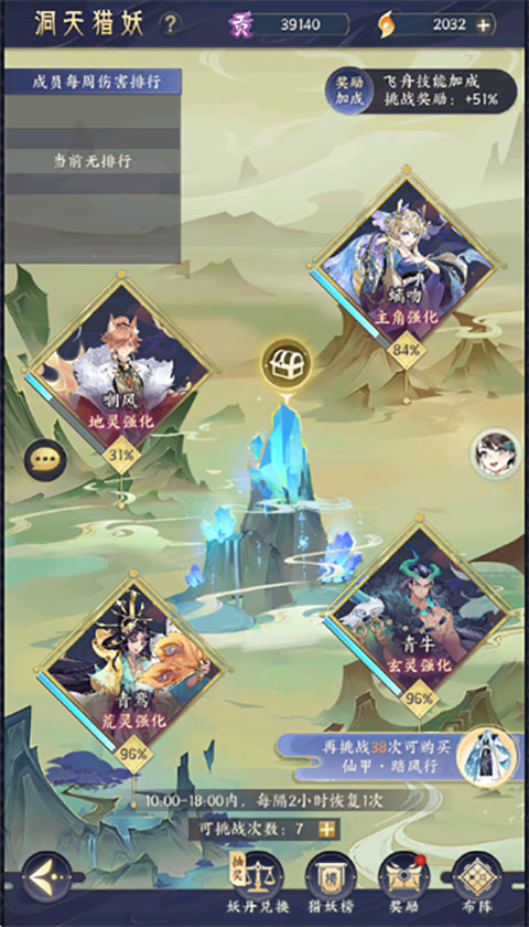 玩法说明:使用从仙盟玩法中获取的法阵材料进行阵眼的升级,获取相应的属性加成,消耗法阵核心进行阵心升级,可提高阵眼等级上限,增加百分比妖灵属性。
