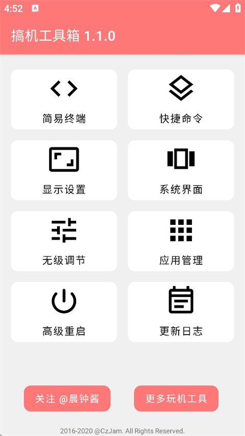 搞机工具箱App是由开发者晨钟酱专为爱搞机人群设计打造的多功能工具箱。搞机工具箱App功能丰富,能够快速修改用户手机的参数,让手机能够更加符合用户的需求,为各位带来很多实用的功能,拥有终端、显示设置、软件设置以及触控模拟、系统界面、无极调节等等,命令行、按键模拟、截屏推送以及显示屏调节等超多功能,功能的分类很详细,操作简单,经典再次升级,有需要的玩机发烧友可以加入其中,感受一下安卓版有何不同,欢迎有需要的朋友下载使用!