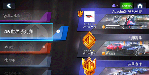 狂野飙车8联赛级别从低到高依次为业余联赛/挑战者联赛/ 职业联赛/ 冠军联赛/精英联赛。