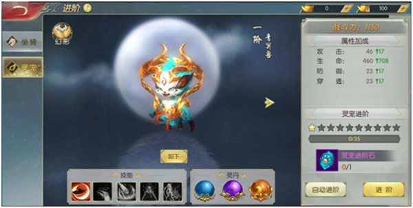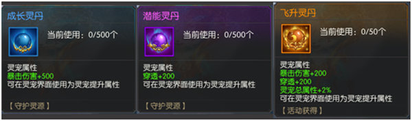 可使用成长灵丹、潜能灵丹和飞升灵丹给灵宠提升属性,三者的使用上限分别为500、500和50。
