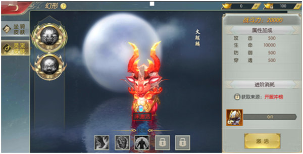 幻形激活后,还可消耗对应的坐骑卡升阶,升阶后可激活特殊技能